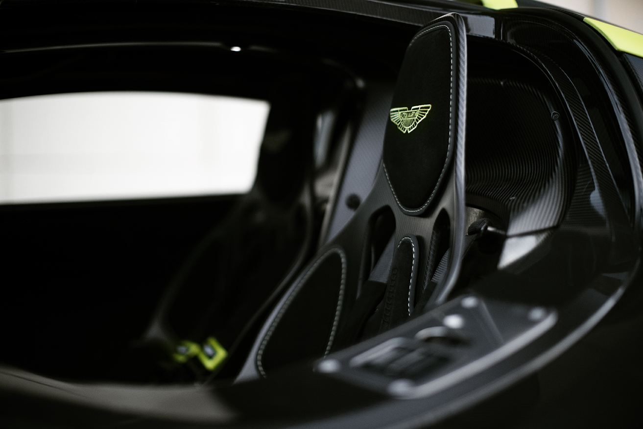 Strap into the phenomenal Aston Martin Valkyrie and the first touch point is the beautiful suede-like Alcantara seat. This uncompromising 1,000 horse power hypercar is closer in DNA to a Formula One racing machine than a road car, which explains the minimalist, weight-saving philosophy throughout its cockpit.